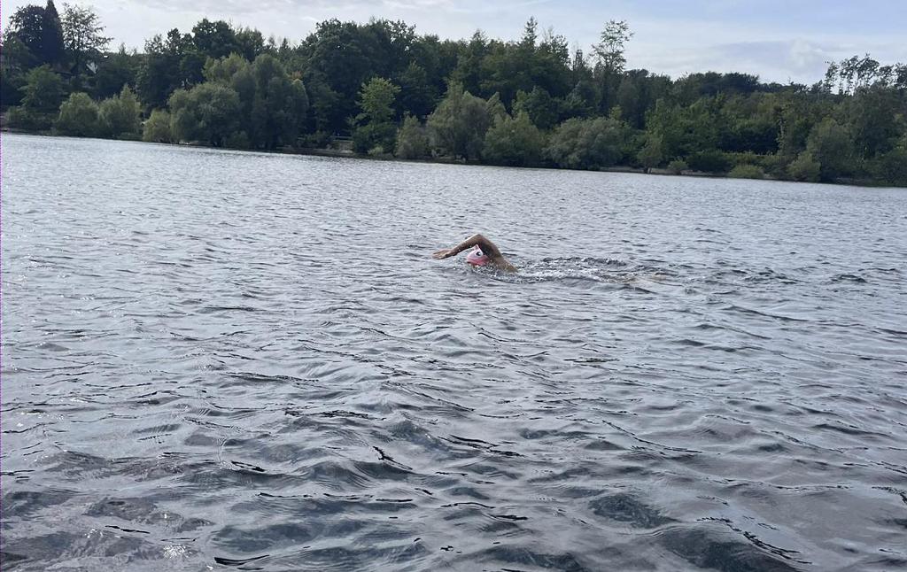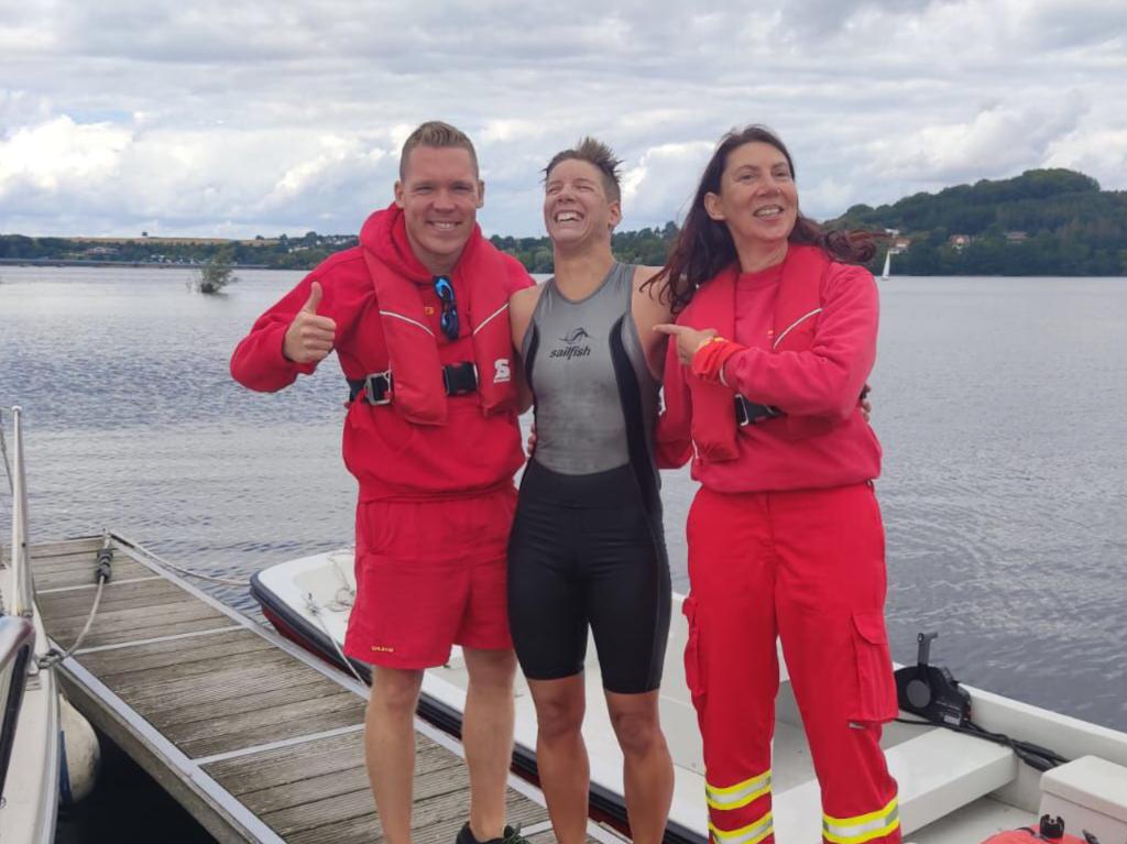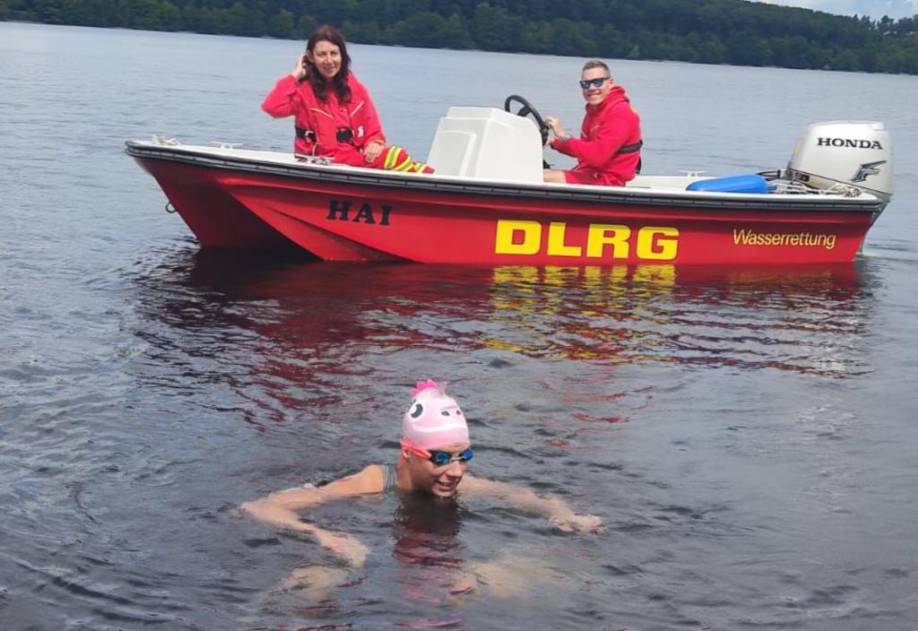 Geschafft! - Jennifer Thater hat die im Rahmen des CharitySwim angekündigte Möhnesee-Schwimmstrecke trotz wetterbedingter Widrigkeiten erfolgreich gemeistert.