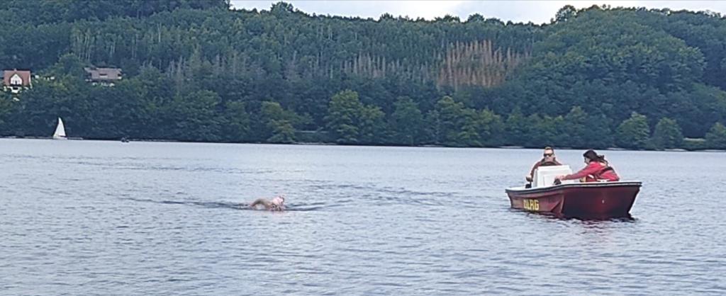 Gleichfalls war das Schwimmen am Nordufer in Richtung Körbecker Brücke eine große Herausforderung, da die Wellen nun direkt gegen die Schwimmrichtung waren. Ohne das Begleitboot der DLRG Dortmund-Mitte wäre ein Kurshalten unmöglich gewesen. So fuhr das Boot leicht voraus, um den Weg zu weisen.