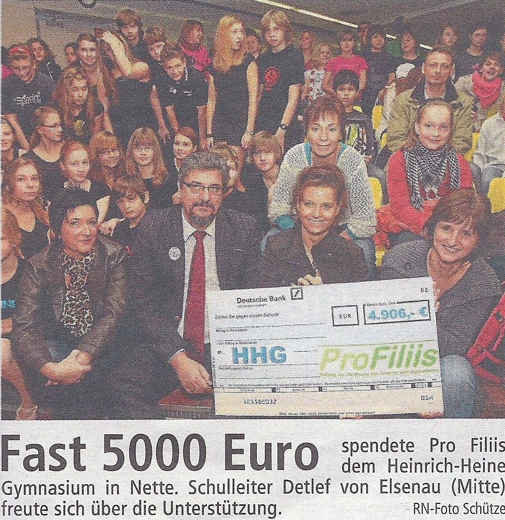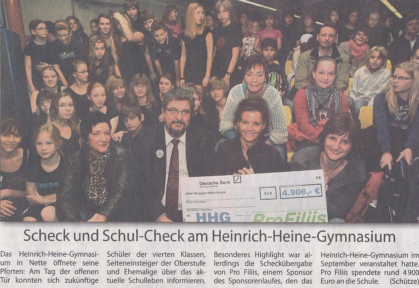 Scheckübergabe am Heinrich-Heine-Gymnasium wegen des Sponsorenlaufs