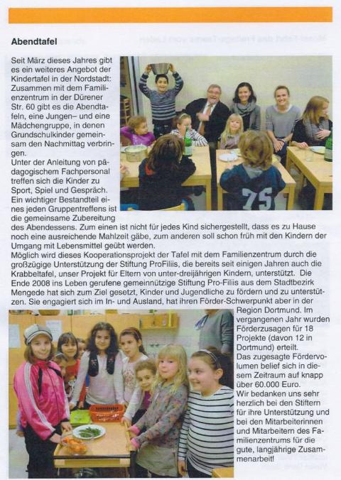 Wie in den vorherigen Jahren hat die ProFiliis-Stiftung die Dortmunder Tafel auch im Jahr 2016 bei der Durchführung der Abendtafel unterstützt und einem zusätzlichen Angebot Förderung zugesagt: der Abendtafel in der Stollenstraße. Auf diese Weise können noch mehr Jungen und Mädchen mit gesundem Abendbrot versorgt und pädagogisch betreut werden.