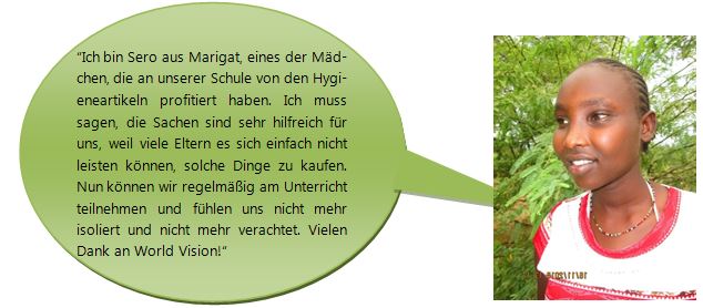 Um diesem Missstand entgegenzuwirken, hat World Vision eine Initiative ins Leben gerufen: Schulmädchen erhalten Pakete mit einer Hygieneausstattung, die sie für den Umgang mit ihrer Menstruation versorgt. In diesen Paketen enthalten sind