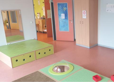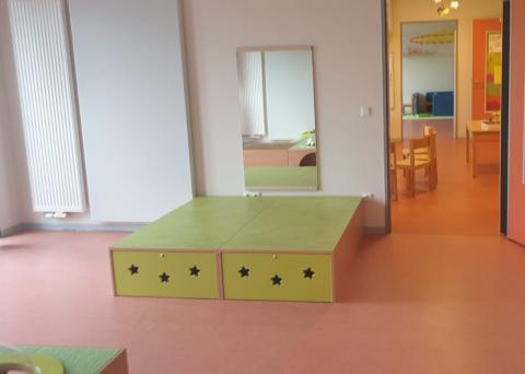 Da einige der Kinder nach dem Mittagessen ein kleine Schlafpause benötigen, wurden in diesem Raum Schlafplätze erschaffen: Unter einem flachen Podest verbergen sich Matratzen auf ausziehbaren Lattenrosten, die nach Bedarf hervorgeholt werden können. Nach dem Mittagsschlaf werden sie wieder unter das Podest geschoben und nehmen keinen Platz für andere Aktivitäten weg. So ist das Podest mit der neu errichteten Spiegelwand samt Ballettstange beispielsweise als „Tanzstudio“ und Theaterbühne nutzbar.