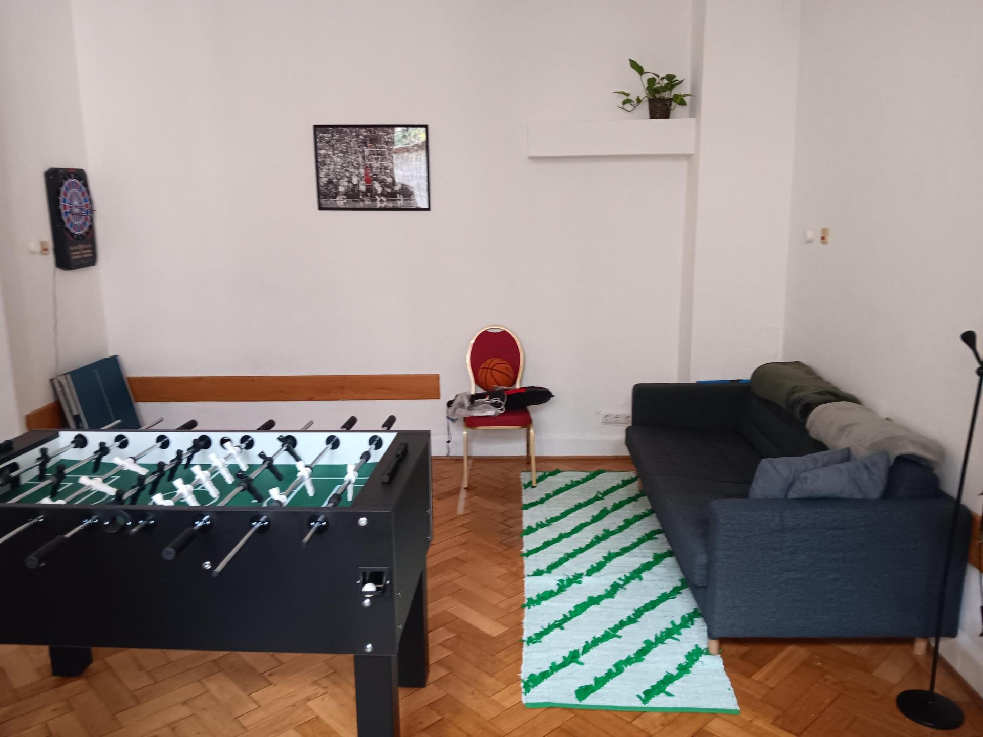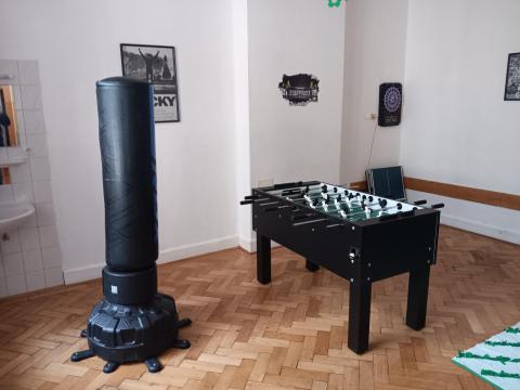 „So wurde im Gemeinschaftsraum mit Sofas, Stehlampen, Bildern, Kissen und einem Teppich eine angenehme Atmosphäre geschaffen, Gesellschaftsspiele und eine Playstation sorgen für Unterhaltung, Bücher und Spiele zum Deutschlernen für einen leichteren Einstieg in die deutsche Sprache. Zur sportlichen Betätigung konnten wir einen Boxsack, eine kleine Tischtennisplatte, eine Dartscheibe und als Herzstück einen Kicker erwerben, der nun in jeder freien Minute bespielt wird.“ (aus dem Abschlussbericht der Diakonie) Außerdem wurde für den Außenbereich ein Grill angeschafft, an dem die Jugendlichen und ihre Betreuer:innen gemeinschaftsfördernde Sommerabende verbringen können.