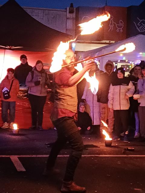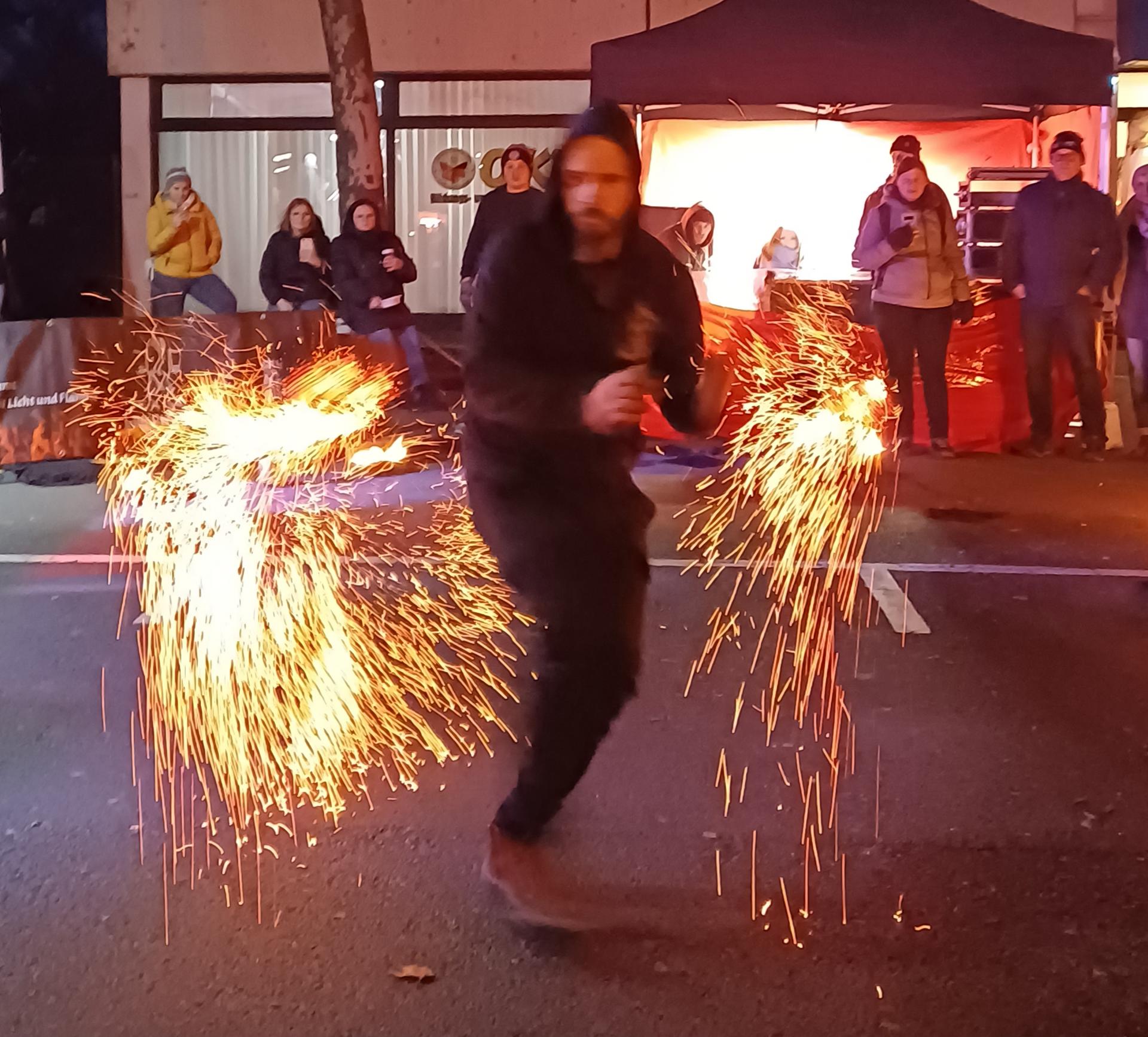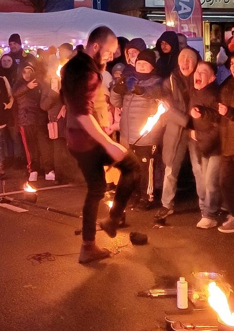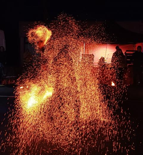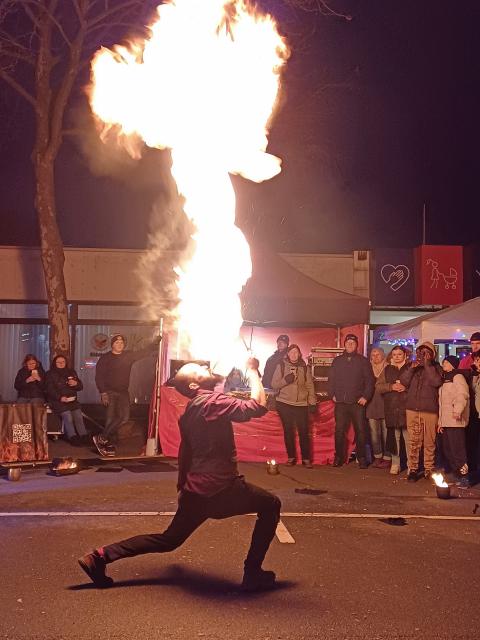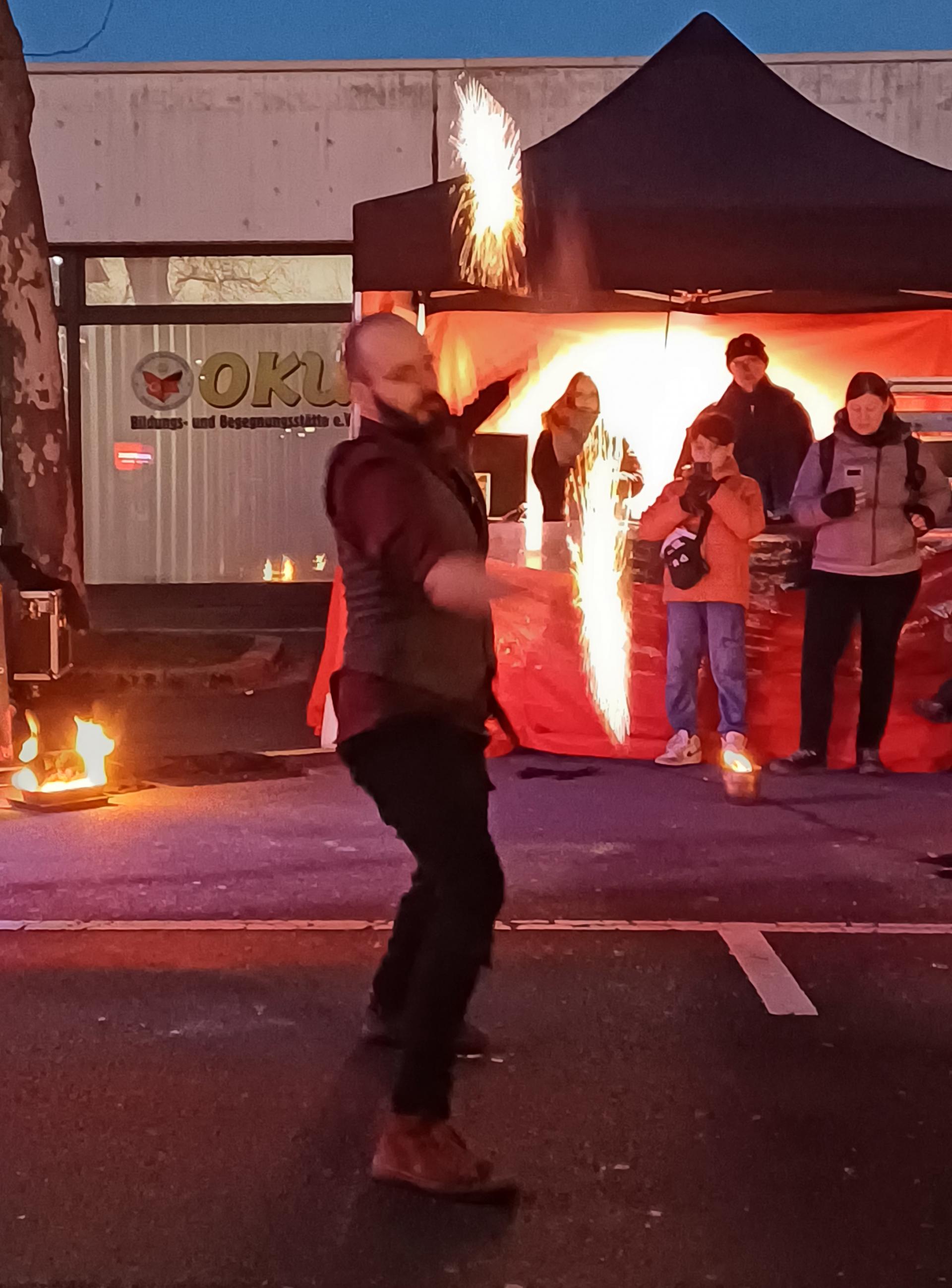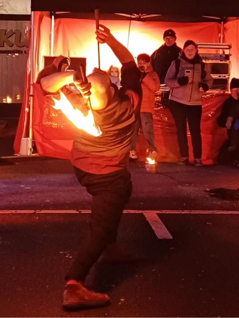 Auch der Feuerworkshop wurde von den jungen Besucher:innen des Festes sehr gut angenommen. Sie übten verschiedene Elemente einer Feuershow ein, wobei das Feuerspucken das absolute Highlight war. Den großen Abschluss und gleichzeitig Höhepunkt des Winterfestes bildete eine professionelle Feuershow, bei der einige Kinder aus dem Workshop mitmachen und stolz ihre neu erlernten Fertigkeiten präsentieren konnten.
