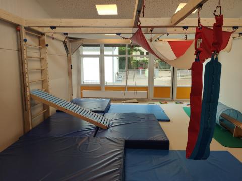Der Förderverein machte sich auf die Suche nach finanzieller Unterstützung und fragte diese unter anderem auch bei ProFiliis an. Die Stiftung sagte zu, sich an den Gesamtkosten in Höhe von 18.000,- Euro mit 5.000,- Euro zu beteiligen. Der Raum musste vorbereitend umgebaut werden, das Grundgerüst mit Schienensystem etc. erworben und montiert werden, sowie Bewegungsmaterial wie Schaukel und Kletternetz angeschafft werden.