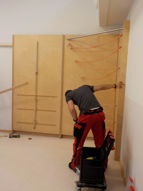 Inzwischen sind die Arbeiten abgeschlossen und das Kita-Team ist sehr zufrieden: Durch das Schienensystem können die Bewegungsmaterialen in vielen verschiedenen Aufbauten arrangiert werden, um immer neue Anregungen zu liefern. Zudem bietet es die Möglichkeit, es zukünftig sukzessive zu erweitern.“