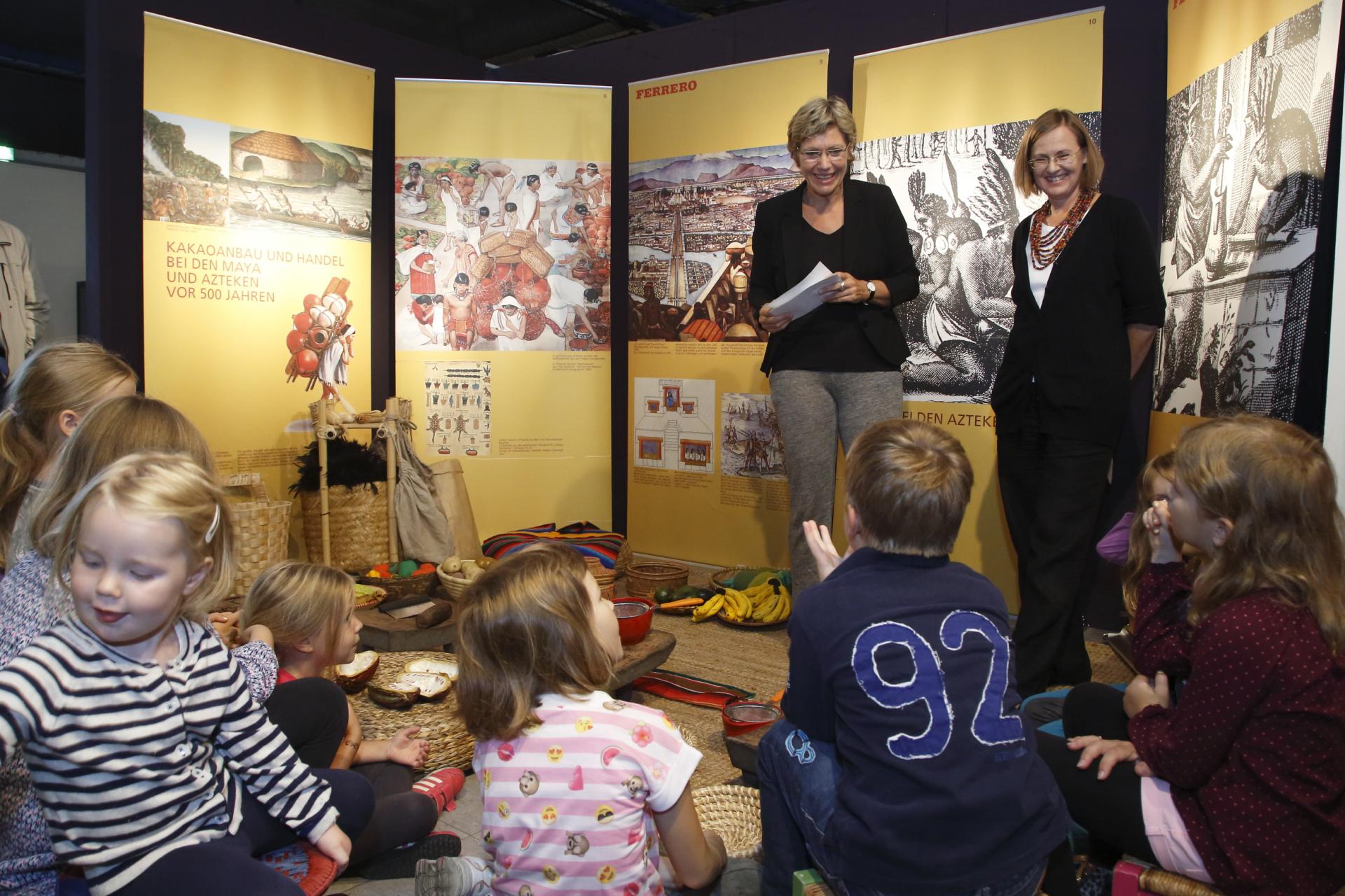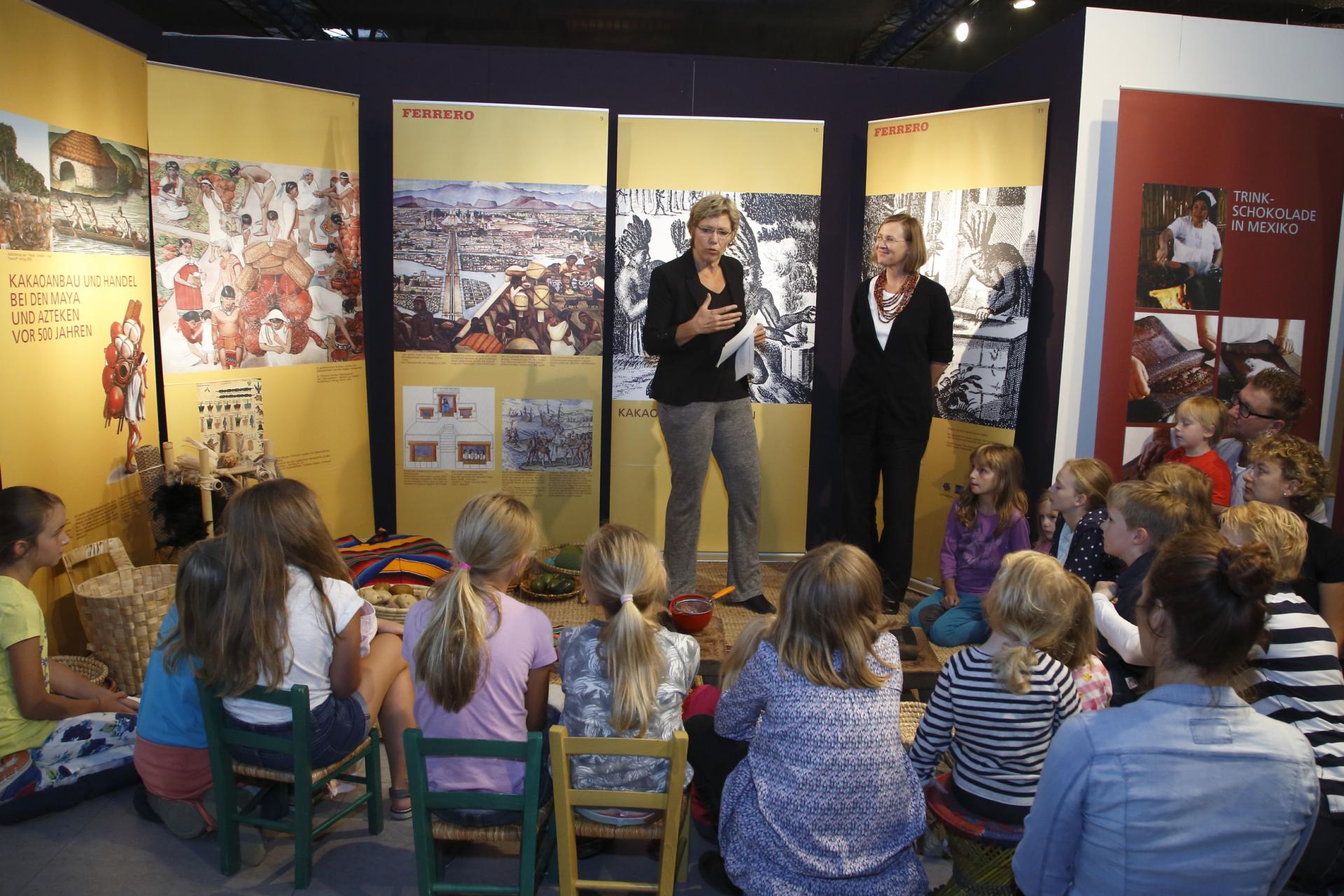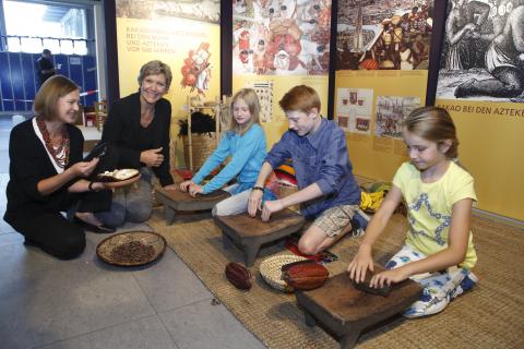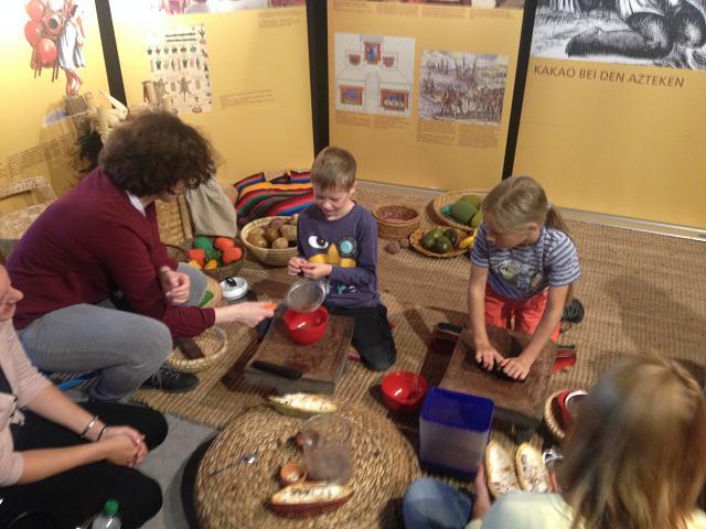 Das Kindermuseum Nürnberg hat zu diesem Thema eine Wanderausstellung entwickelt, die sich mit der Kakaofrucht und deren verschiedenen Verarbeitungsweisen beschäftigt. Die Besucher:innen können eine Reise in die Vergangenheit machen und herausfinden, wie Schokolade bei den Azteken hergestellt wurde, um dann Einblicke in die moderne Schokoladenherstellung, wie sie in Fabriken stattfindet, zu erhalten. Außerdem wird der Alltag einer Familie, die vom Anbau von Kakaopflanzen lebt, vorgestellt.