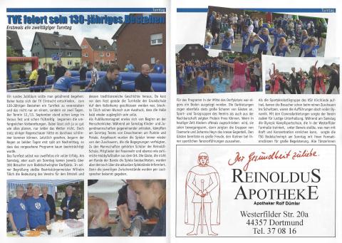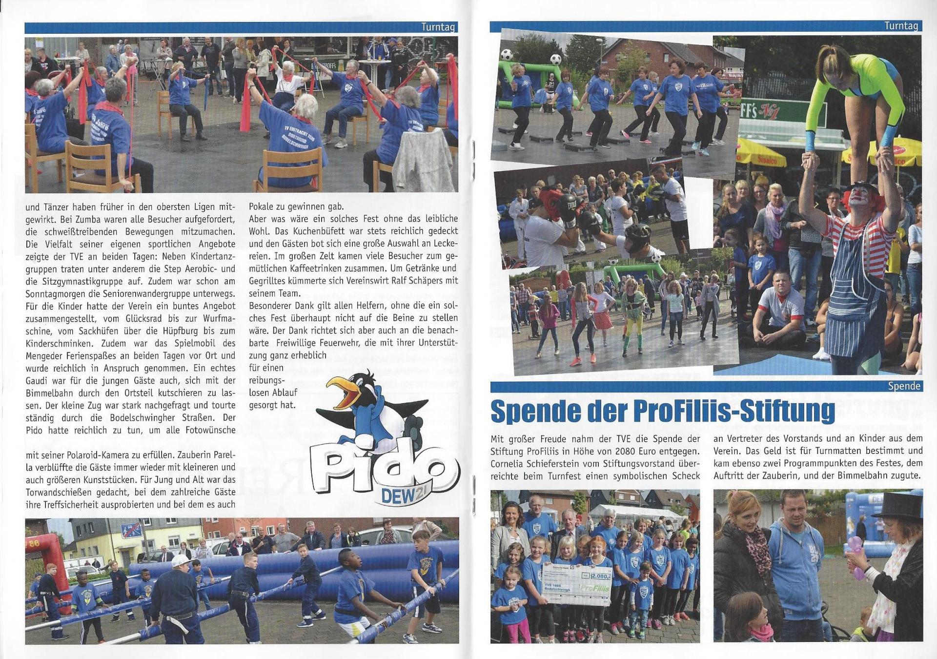 Der TV Eintracht 1885 Bodelschwingh ist ein Verein, der an der Förderung der Gesundheit seiner momentan über 500 Mitglieder durch Turnen interessiert ist. In diesem Jahr feiert der Verein sein 130-jähriges Bestehen. Aus diesem Anlass fand am 12. und 13. September ein großes Turnfest statt. Bei diesem Fest fanden neben zahlreichen anderen Attraktionen auch verschiedene Aufführungen statt, bei denen verschiedene akrobatische Turnfiguren zu bestaunen waren. Damit die Turnerinnen und Turner gut geschützt sind, wurden hierfür neue Turnmatten angeschafft, die nun in den weiteren Vereinsaktivitäten eingesetzt werden. Auch eine Zauberkünstlerin war anwesend, die für die Kinder unter anderem Luftballontiere modelliert hat. Ein weiterer Programmpunkt war der Menschenkicker. Hierbei wurden die Kinder und Jugendlichen selbst zu Kickerfiguren und versuchten Tore zu schießen, ohne dass sie sich frei im Spielfeld bewegen konnten.