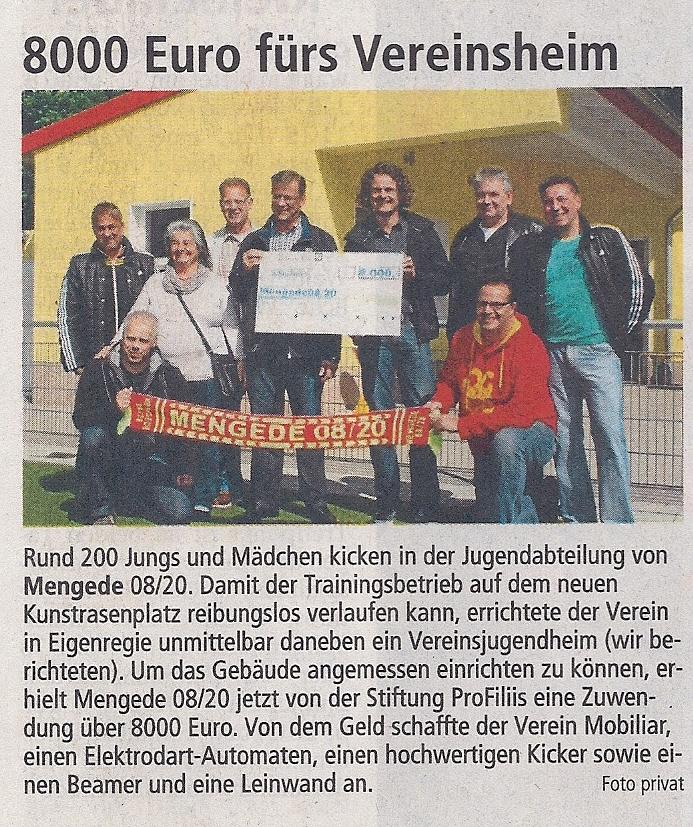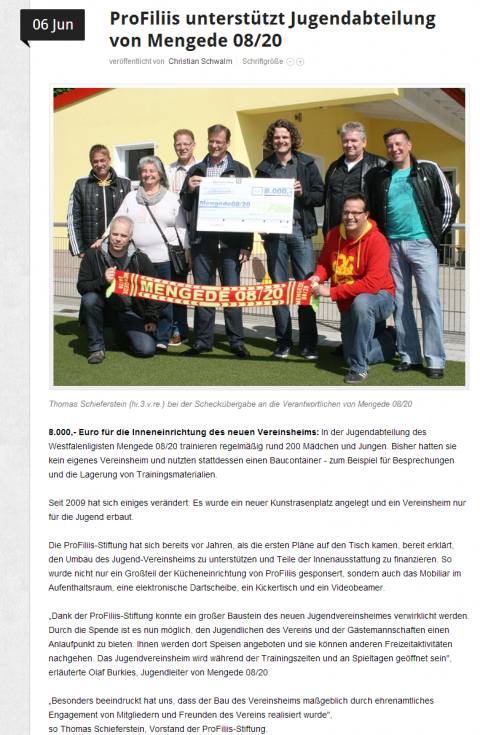 Schon 2009 hat ProFiliis der Jugendabteilung des Fussball-Landesligisten Mengede 08/20 Unterstützung bei der Möblierung des Vereinsheimes zugesagt. Allerdings musste die Einrichtung einer neuen Kunstrasenanlage und danach die Errichtung des Jugend-Vereinsheims abgewartet werden. Denn auch letzteres gab es in 2009 noch gar nicht. Stattdessen wurde ein alter Baucontainer z. B. als Verkaufsstand und LAger für Trainingsmaterialien genutzt.