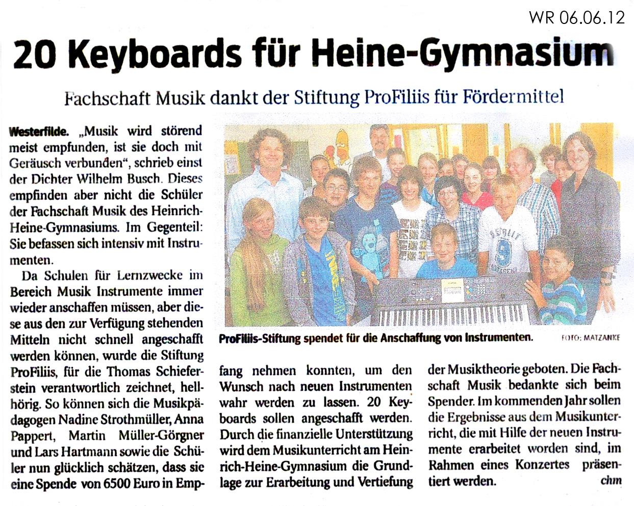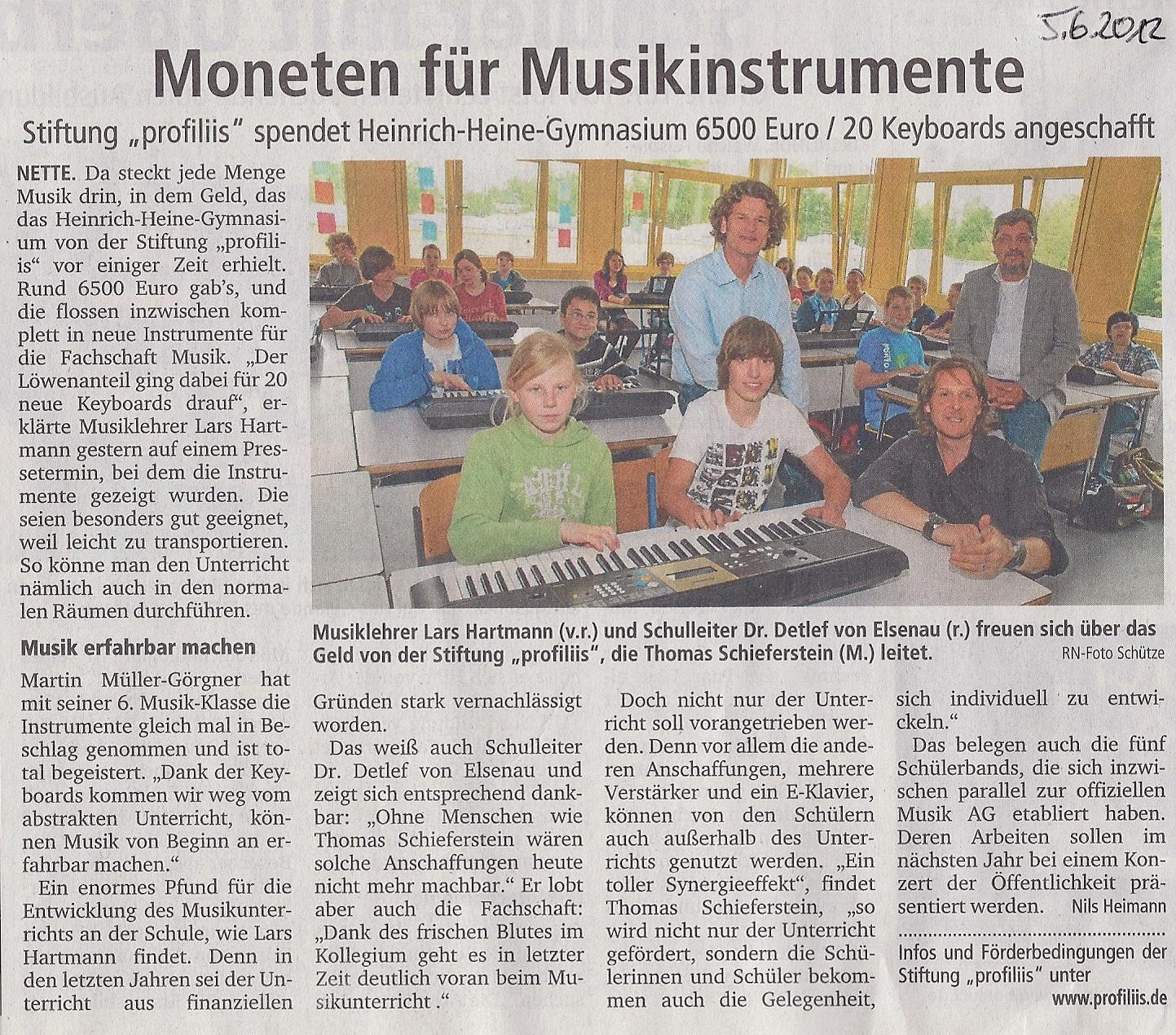 Damit am Heinrich Heine Gymnasium ein zeitgemäßer und vor allem praxis- bzw. projektorientierter Musikunterricht für alle Schülerinnen und Schüler der Sekundarstufen I und 11angeboten werden kann, benötigt die Schule, der Fachbereich Musik, dringend neue Instrumente und dazu gehörige Musikanlagen (Verstärker, Gesangsanlagen, Mikrophone, Digitalpiano etc.).