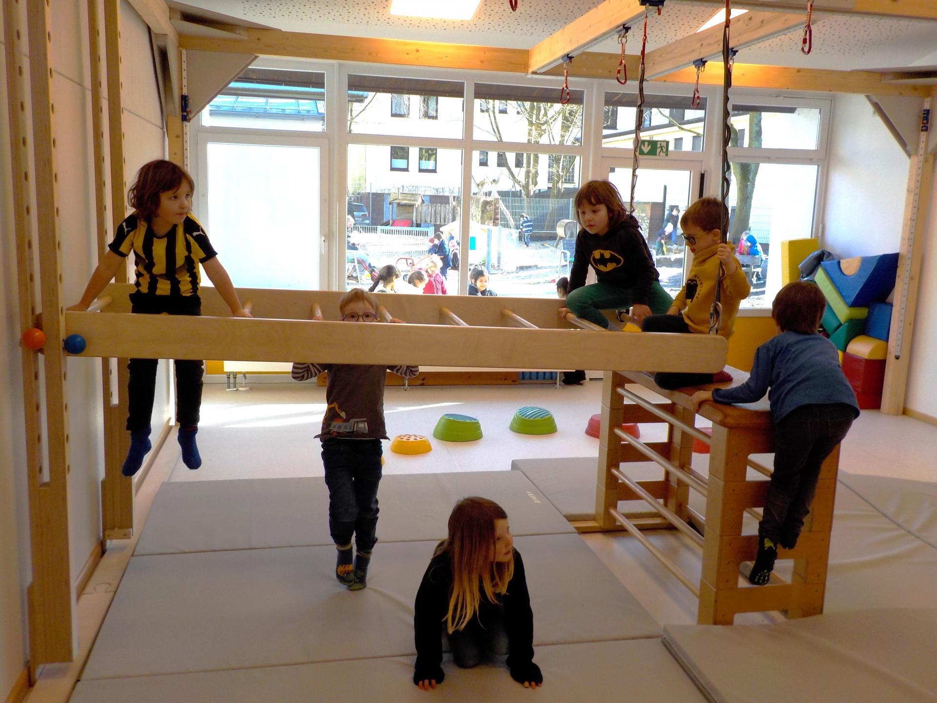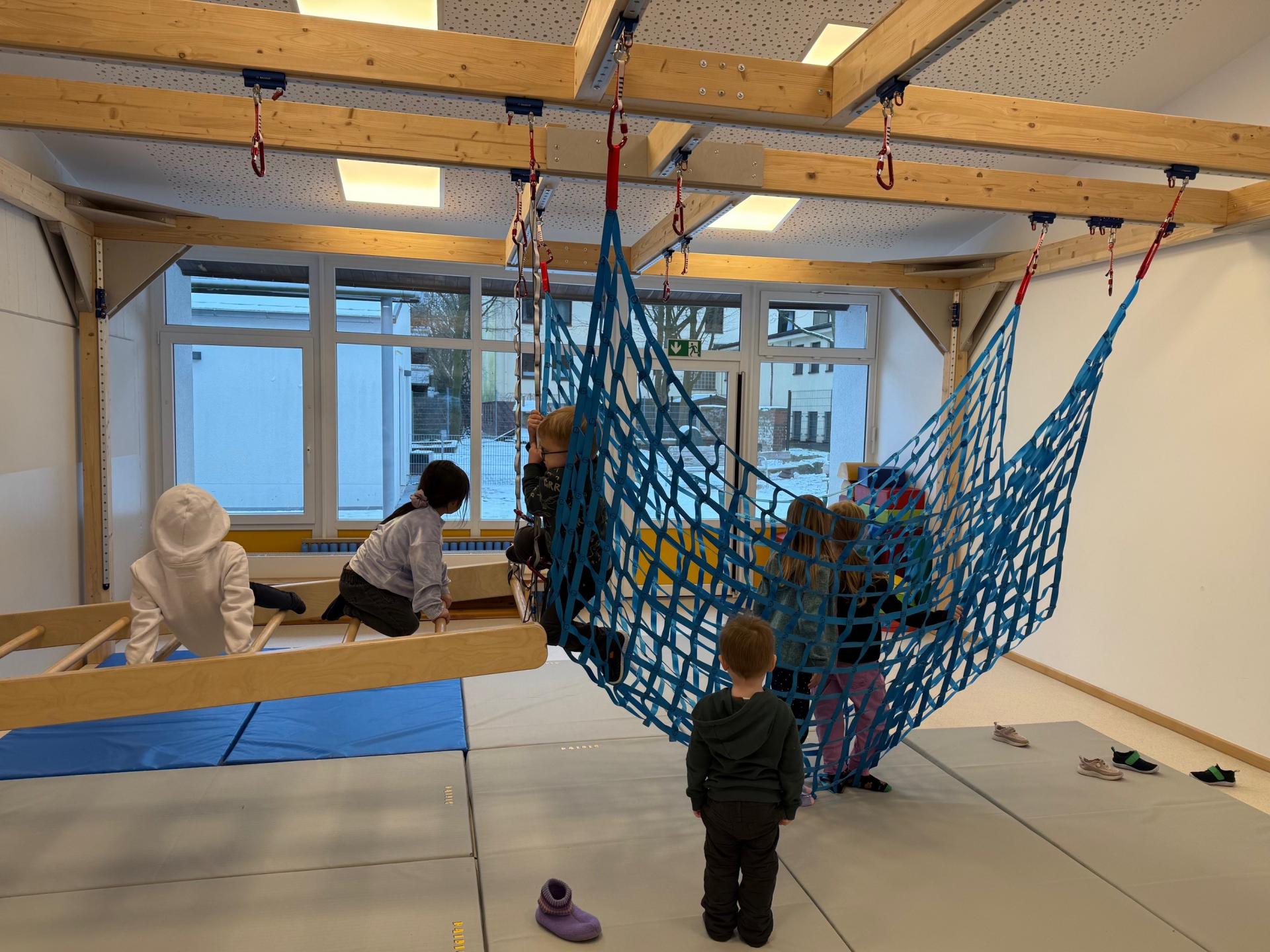 Der Förderverein machte sich auf die Suche nach finanzieller Unterstützung und fragte diese unter anderem auch bei ProFiliis an. Die Stiftung sagte zu, sich an den Gesamtkosten in Höhe von 18.000,- Euro mit 5.000,- Euro zu beteiligen. Der Raum musste vorbereitend umgebaut werden, das Grundgerüst mit Schienensystem etc. erworben und montiert werden, sowie Bewegungsmaterial wie Schaukel und Kletternetz angeschafft werden.